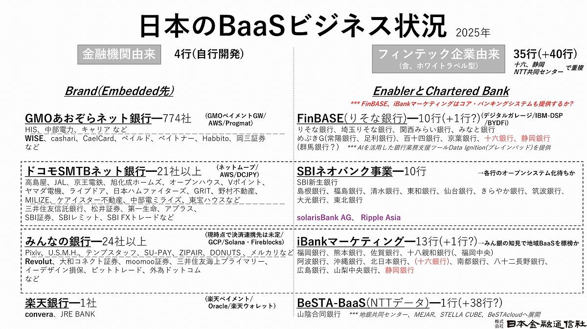 代表的な金融機関系のプレイヤーには、GMOあおぞらネット銀行、ドコモSMTBネット銀行(※2026年8月3日社名変更予定、現:住信SBIネット銀行)、みんなの銀行などがある。これらはいずれも“自行のシステムを開放する”という形でBaaS提供を始めたが、近年ではそれを外販ビジネスとしても本格展開し始めている。