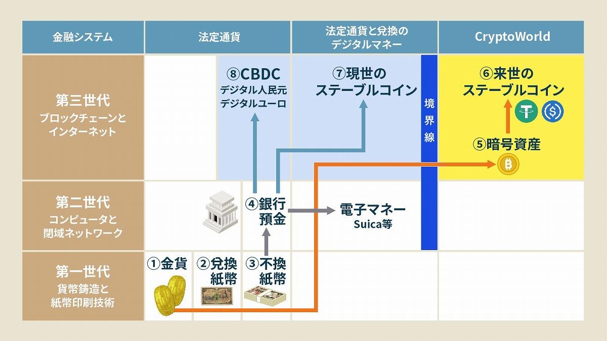 ステーブルコインとは、取引価格が安定することを企図して設計された、ブロックチェーンと呼ぶ分散台帳に記録される数値である。価格の安定のため、法定通貨との兌換性を保証することで価格に対する信用を生み出す仕組みである。金融システムの発展の歴史を踏まえると、ステーブルコインは、2つに大別される。下図に示す⑤暗号資産は、「中央銀行―市中銀行」によって支えられている第2世代の金融システムから連続的に生まれたものではなく、ブロックチェーンという暗号技術を使った分散台帳を利用して“突如として”飛び地に生まれたものである。