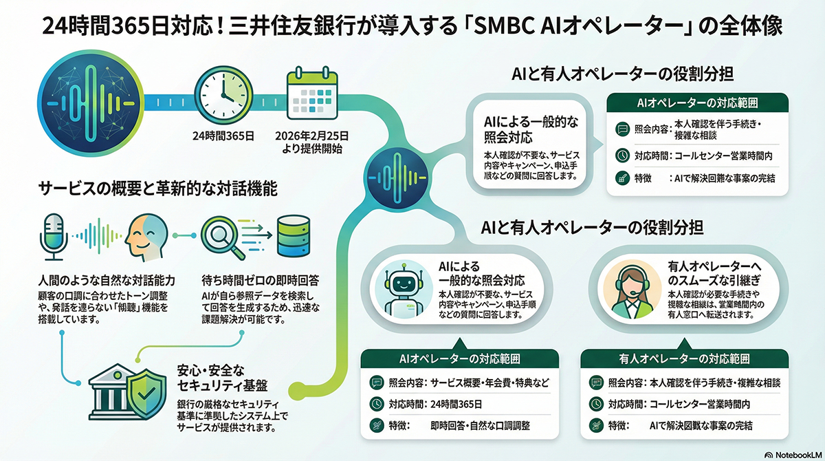 導入の第1弾として、個人向けサービス「Olive」の専用ダイヤルに適用される。対応範囲は、サービス内容や年会費の確認、各種キャンペーンや特典の概要、申し込みや切り替え手続きの案内など、本人確認を必要としない一般的な照会業務となる。これにより、顧客は電話がつながるまでの待ち時間を気にすることなく、いつでも必要な情報を得ることができるようになる。一方で、本人確認が必要な手続きや、AIでは解決できない複雑な相談については、これまで通り有人のオペレーターが対応する。