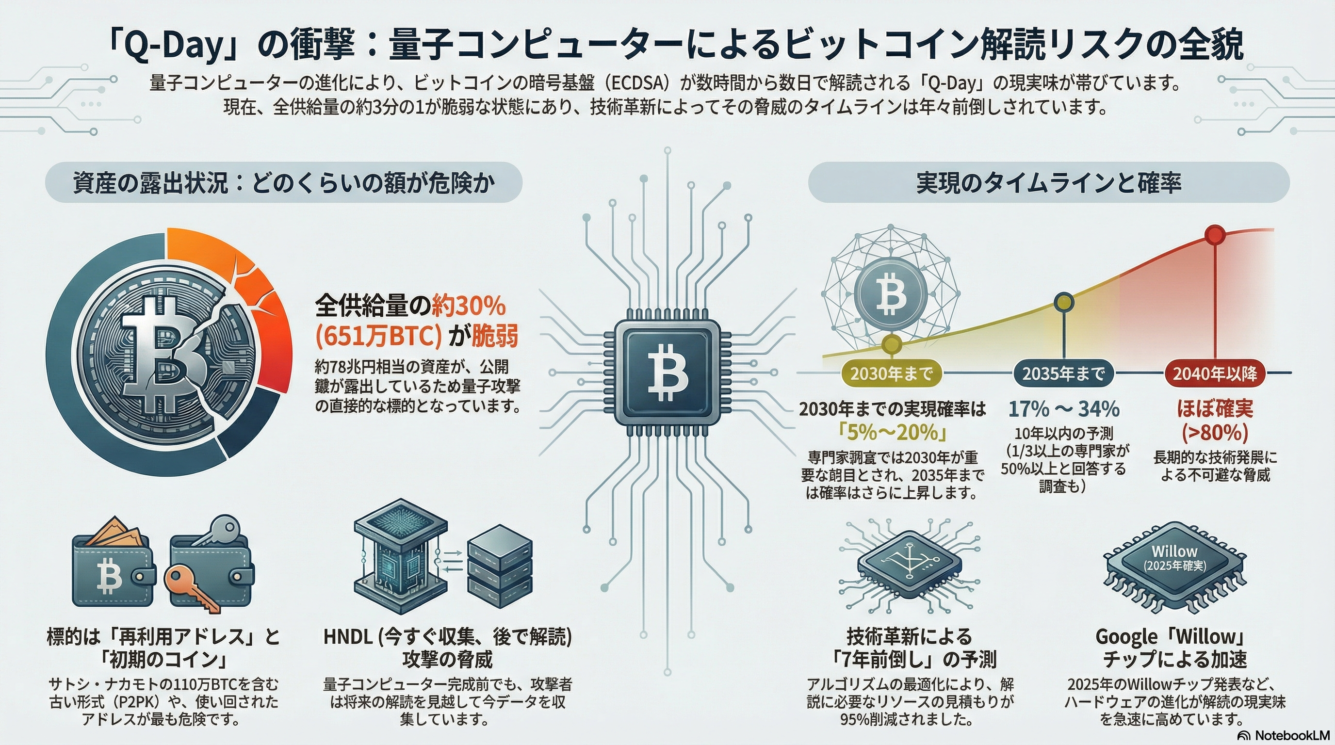 量子コンピュータによる脅威の具体的な規模として、全供給量の約3分の1に相当する約651万ビットコイン、現在の価格換算で約78兆円相当が脆弱な状態にあるという調査結果が示された。この中には創設者であるサトシ・ナカモトが保有するとされる初期の資金も含まれており、秘密鍵が失われているか長期間休眠状態にある約172万ビットコインは、所有者自身による安全なアドレスへの移行が不可能な状態にある。一方、残りの約449万ビットコインは、所有者が公開鍵の共有や再利用を避け、新しい量子耐性アドレスへ資金を移動することで保護できると分類された。