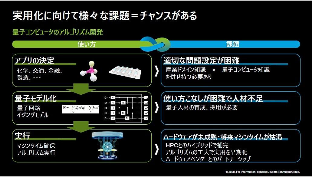 実用化初期フェーズの量子コンピューターは、APIでスムーズに動くといった単純なものではない可能性が高い。このため、量子ハードウェアの特性や制約を理解し、それに合わせたアルゴリズムを設計・実装できる人材が必要。