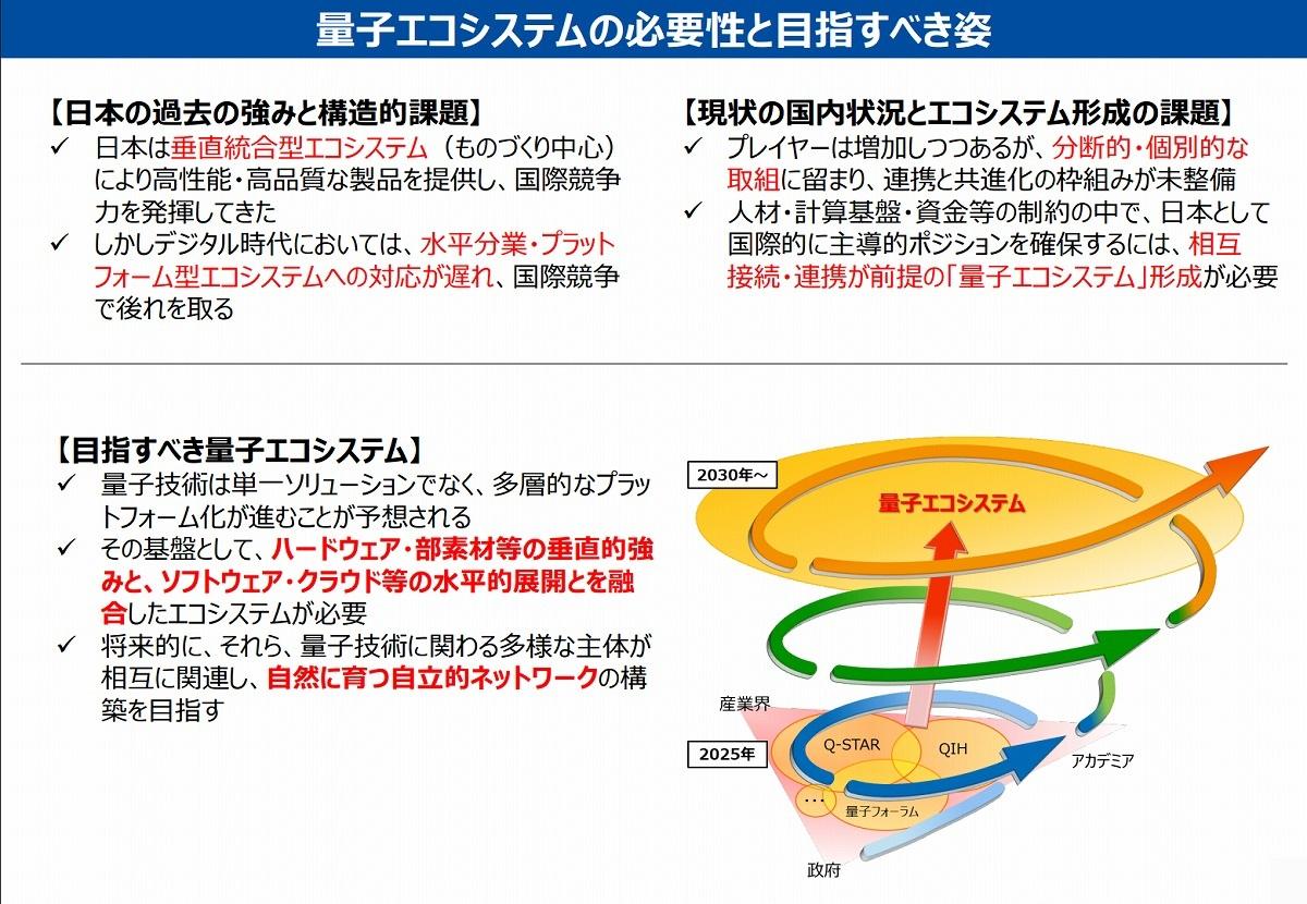 政府は、デジタル時代の国際競争上の失敗を踏まえ、量子技術に関わる多様な主体が相互に関連した「自律的ネットワーク」の構築を提唱している。