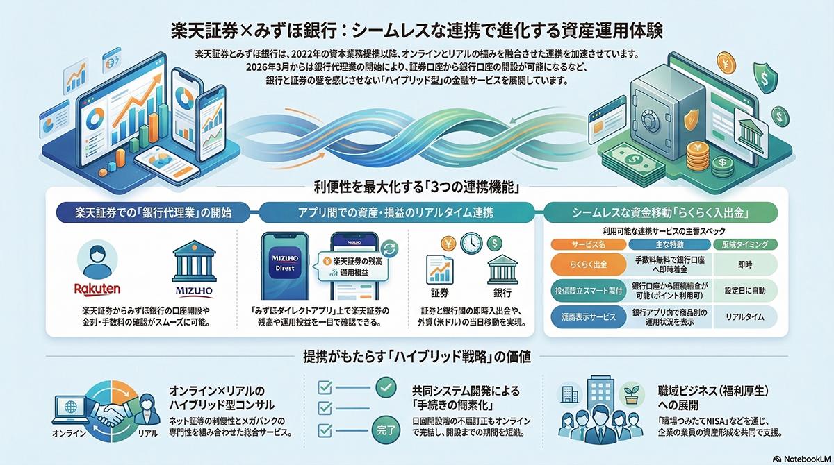 楽天証券ホールディングスとみずほ証券は2022年10月に戦略的資本業務提携を結んでいる。以降、両社はオンラインと実店舗の強みを融合させる形で協業を進めてきた。証券口座と銀行口座の間で円滑な資金移動を実現する入出金サービスや、手数料無料で最短当日に米ドルの入出金が可能な仕組みなどをすでに提供し、顧客の利便性向上を図ってきた実績がある。企業の人的資本経営を後押しする金融経済教育プログラムや、福利厚生としての投資制度の導入支援など、法人向けビジネスの領域でも共同でサービスを展開している。