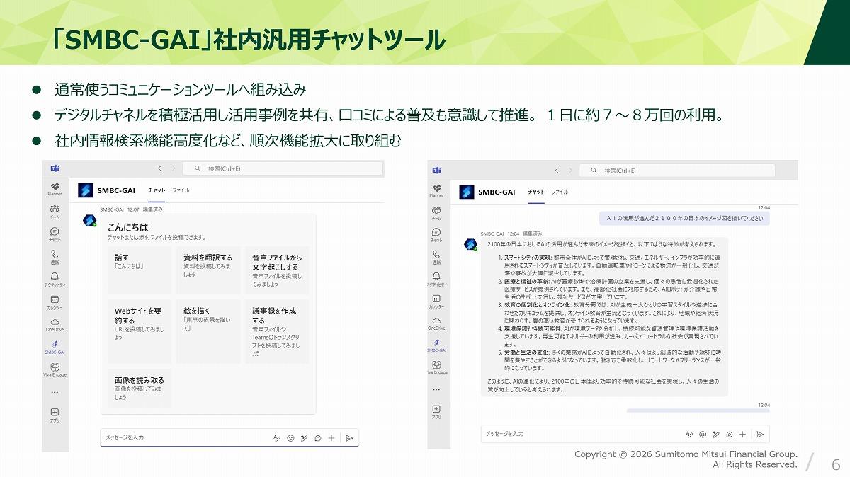 では、実際のAI活用の取り組みを見てみると、まず目を引くのが、全グループ員が日常的に使える社内汎用チャットツール「SMBC-GAI」の浸透ぶりだ。
