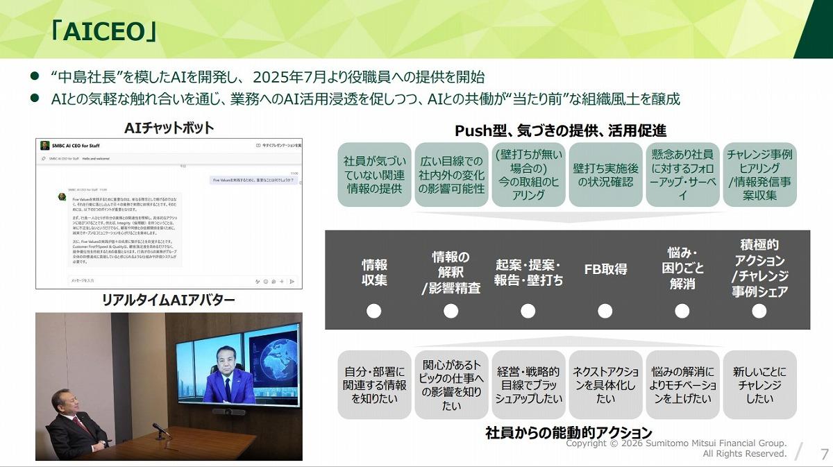 同じ文脈で注目されたのが、中島社長を模した「AICEO」の取り組みだ。経営会議やイベントでの発言データを学習させ、社長目線の情報や気づきを従業員に提供するチャットボットとして実験的に開発された。