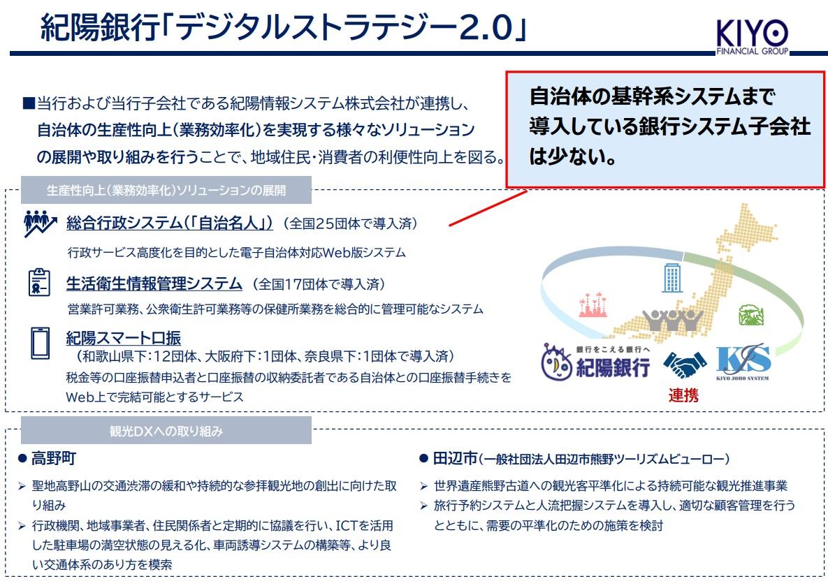 また、DXの面では、金融機関自身が地域における「デジタル化先進事例」に該当していることでしょう。金融機関が自らのリソースを外部向けに提供することで、プラクティスを有効活用可能です。例えば紀陽銀行ではグループにIT子会社を抱え、自治体向けの業務サービスも提供しています。FISCの安全対策基準に対応したセンター設備を有することで、地域に対する安心安全なサービス提供の基盤機能をかなえることが可能ですし、DX面での地域貢献そのものともいえます。