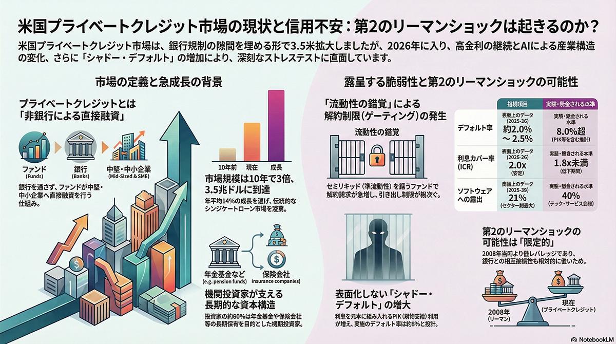 今後数週間で同様の制限措置を導入するファンドはさらに増える見通しである。背景には、米国市場におけるプライベートクレジットへの急速な資金流入がある。日本経済新聞の報道によれば、米国の銀行によるプライベートクレジット向け融資は2025年12月末時点で前年比8割増の3775億ドル(約60兆円)に膨張した。