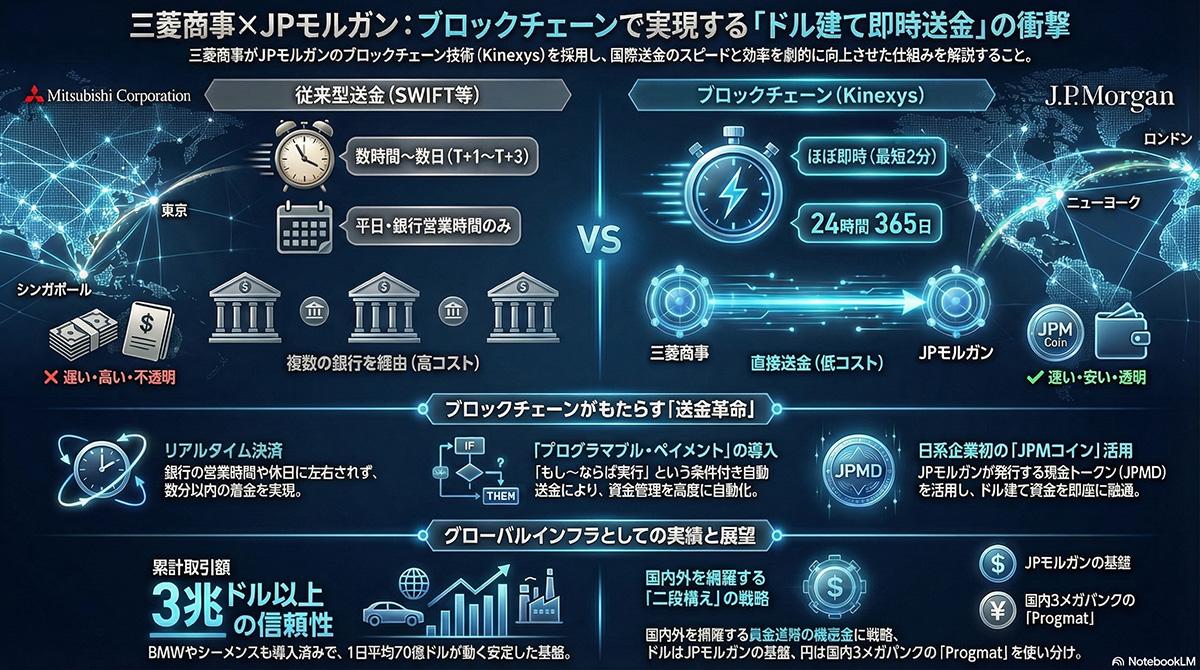 すでにパイロットテストを成功させており、2026年度中の本格展開を予定している 。三菱商事の財務責任者は、変動の激しい市場において即座の資金配分が可能となる、プログラム可能な決済機能の重要性を強調した 。従来の国際送金は、国際銀行間通信協会(SWIFT)のネットワークと仲介銀行を経由する仕組みに依存していたため、手数料が高額になりやすく、処理に数日を要することが課題とされてきた。