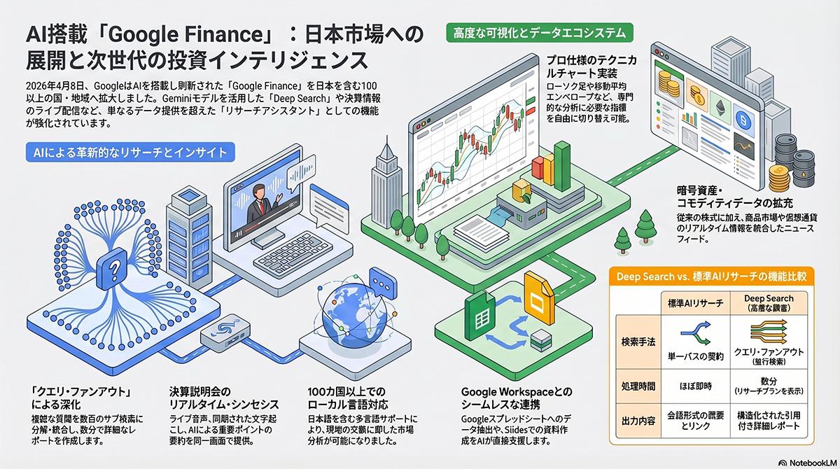 新システムの中核を担うのは、同社の大規模言語モデル「Gemini」を活用した高度なリサーチ機能である。利用者が特定の銘柄や市場トレンドについて質問を入力すると、AIが複数の情報源を解析し、根拠となる参照リンクを添えて回答を生成する。オープンエンドな質問に対応する「Deep Search(ディープサーチ)」機能を利用すれば、より複雑な金融関連の調査においても、引用元を明記した情報を取得できる。さらにKalshiやPolymarketといった予測市場のデータ表示もインターフェースに統合した。