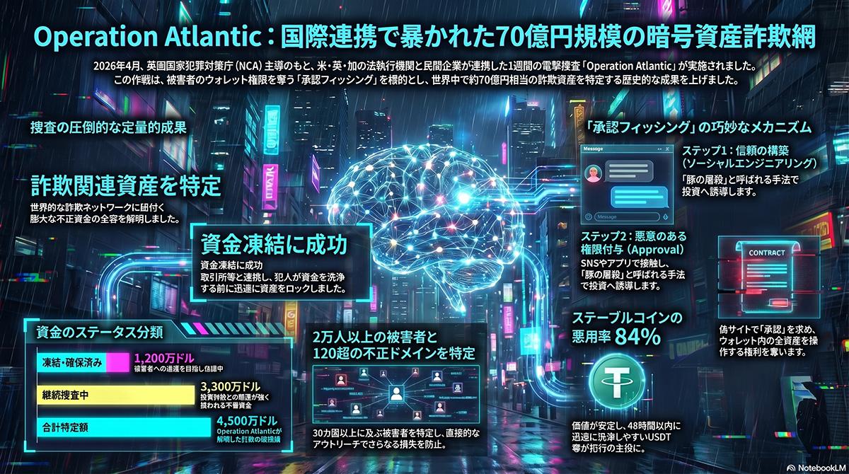 米シークレットサービス、英国国家犯罪対策庁(NCA)、カナダのオンタリオ州警察、オンタリオ証券委員会(OSC)などが共同で実施した国際捜査「Operation Atlantic」は、30カ国以上で暗号資産詐欺の被害に遭った2万人以上のユーザーに関連するウォレットアドレスを特定した。法執行機関は民間企業と連携し、詐欺に関連する合計4500万ドル(約70億円)以上の暗号資産を突き止めている。このうち、不正に移動された1200万ドルについてはすでに凍結措置を講じており、被害者への返還プロセスを進める。残る約3300万ドルの資金についても投資詐欺との関連が疑われており、各機関は引き続き資金の流れを追跡している。
