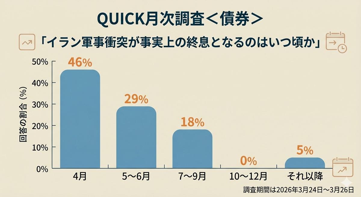 日本株は3月入り後、イラン情勢の悪化に伴う原油高を受け、一時急落したものの、4月中旬時点において、その下落の大部分を埋めた。株価急落の主因となった原油価格については、先行きも供給不安がくすぶると見られることから、2月までの水準に戻るとの見方は少ない。もっとも、イランと米国が停戦に向けて歩みだしているのは事実であり、原油を巡る不安は最悪期をすでに脱したとの見方は多い。その点で参考になるのは、QUICK月次調査<債券>(調査期間は2026年3月24日~3月26日、調査対象者は市場関係者)に含まれていた「イラン軍事衝突が事実上の終息となるのはいつ頃か」という設問である。回答の分布を見ると、4月が46%と最多で、次いで5~6月が29%、7~9月が18%、10~12月が0%、それ以降が5%であった。
