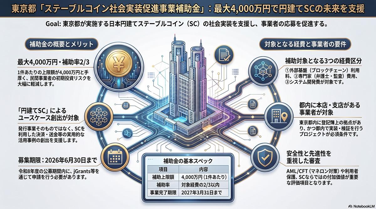 現在、世界のステーブルコイン市場はその大半を米ドル建てが占めており、デジタル空間における経済活動が特定の通貨基盤に偏る傾向にある。東京都はこの状況を背景に、円建てステーブルコインの普及を通じて日本円のプレゼンスを維持および向上させ、決済コストの低減や経済活動の活性化を図る。補助の対象となる経費は、プラットフォーム利用料やノード運用費などの外部基盤利用経費、弁護士や公認会計士等への相談および監査に伴う経費、そしてシステムの設計や開発に要する経費の3区分に分類される。なお、ステーブルコインの発行業務そのものにかかる費用は補助の対象外である。