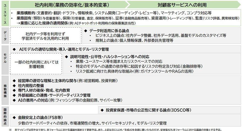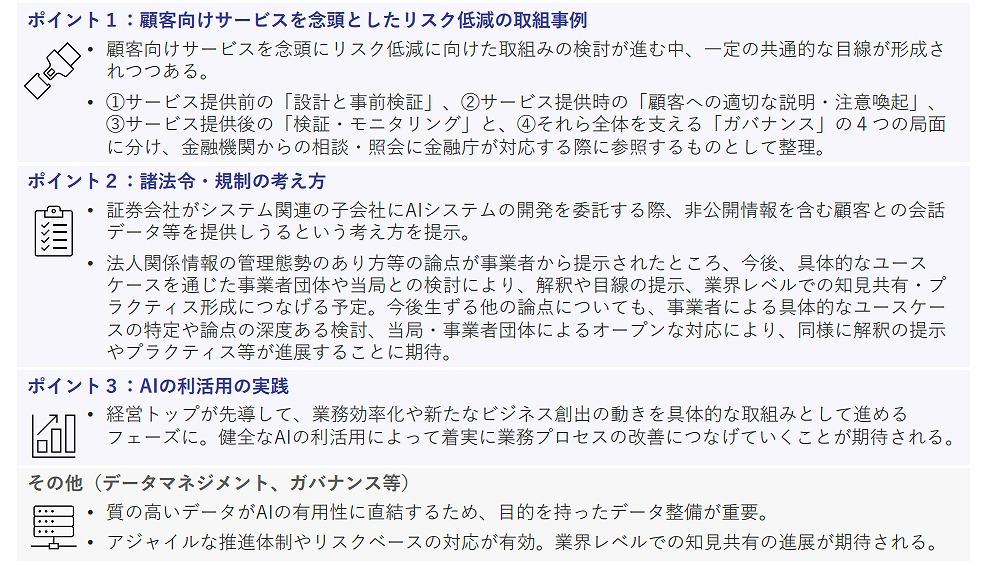 こうした事例を踏まえ、金融庁は改定版で「顧客への資産運用に関する相談対応やコンサルティングなど」を含め、「より金融サービスの本業に近い領域で生成AIを直接顧客向けに活用するような高度なサービスを提供する未来も展望される」との認識を示しています。