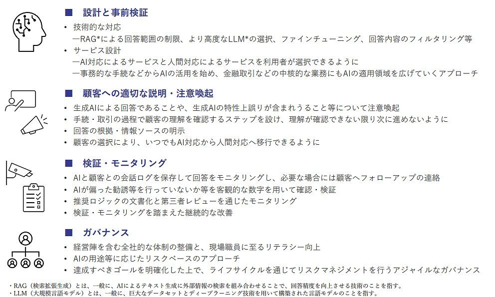 - リスクの高い場面を中心にAIと顧客との会話ログを保存し、不適切な回答がなされていないかをモニタリングし、必要な場合に顧客にフォローアップの連絡を行う態勢を整える
