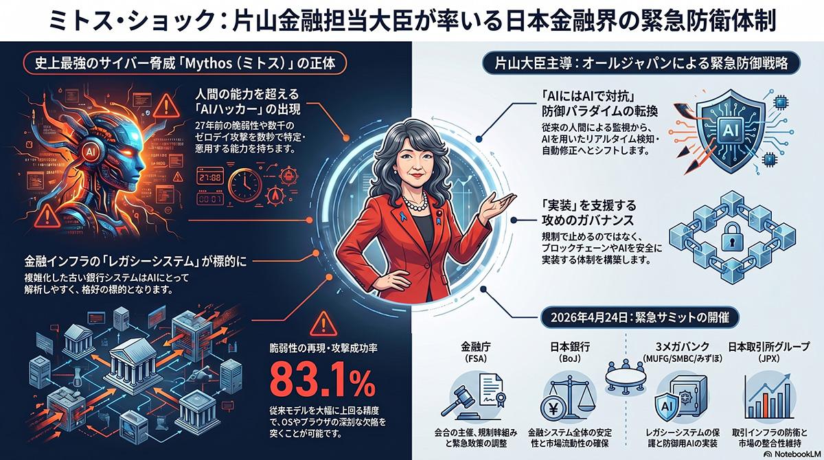 日本の金融庁は各行に対して、単なるシステムのパッチ適用を超えた抜本的な対策を求める。防御側のAIを活用した脆弱性の自動検知や、システム全体へのアクセス権限の厳格化を含むガバナンス体制の再設計が議論の焦点となる。金融インフラの基盤を守るため、政府と金融機関はAIによる新たな脅威に直面した危機管理プロトコルの策定を進める。