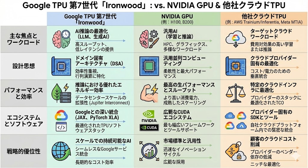 一方、これまでAIアクセラレータ市場をほぼ独占してきたNVIDIAのGPU、特に大規模AIモデル用GPUとの関係も注目される。NVIDIAの強みは成熟したソフトウェアエコシステム(CUDA、トレーニング/推論用ライブラリ群)と、汎用計算能力の高さにある。対してIronwoodは、Googleのソフトウェアスタック(たとえば TensorFlow や JAX、およびそのコンパイラ XLA)と垂直統合された環境であり、ハードウェアとソフトウェアの両面で最適化されている。こうした垂直統合はGPUのような汎用環境と比べて、特定タスクにおいて大きな効率差を生む可能性がある。