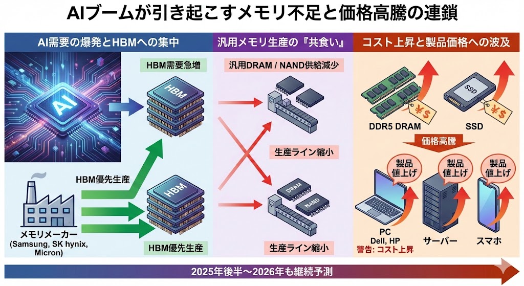 また、AI用途向けに高性能な「高帯域幅メモリ(HBM)」や大容量DRAMを求める需要が増えているが、これらは従来型メモリの生産能力を圧迫するため、全体として供給ひっ迫と価格上昇が長期化する可能性がある。複数の半導体メーカーやアナリストは、この傾向が少なくとも2026年以降も続く見通しを示している。