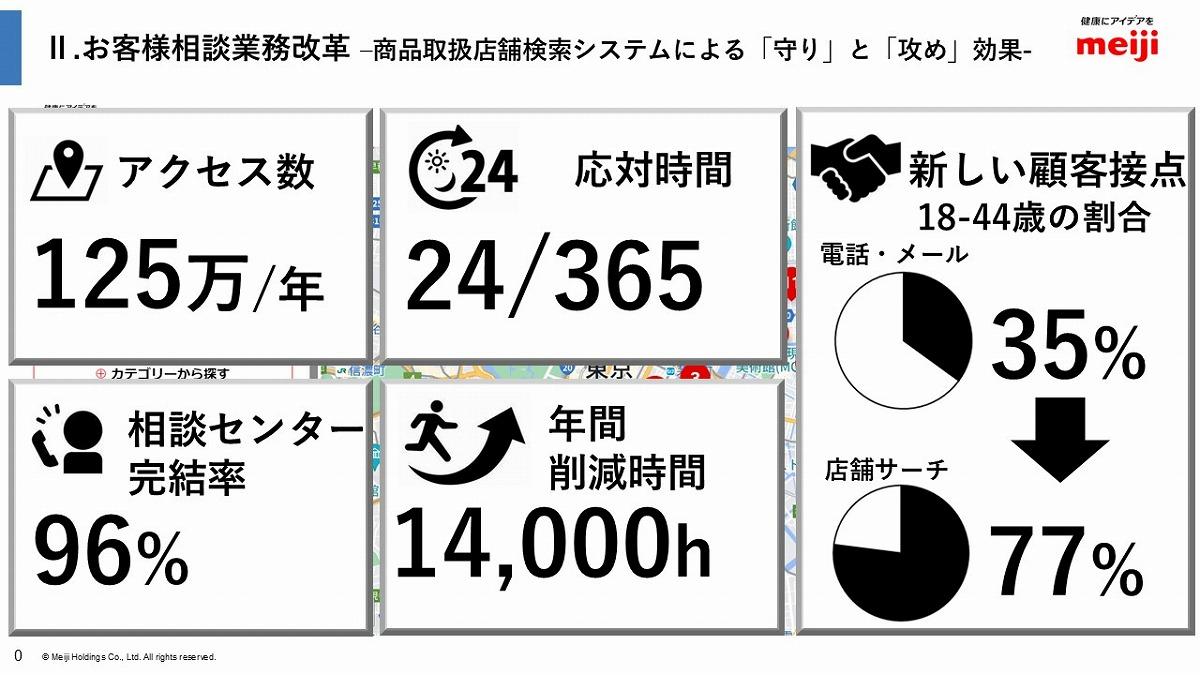 グループのDX戦略として「データドリブン経営を実践することで『meijiらしい健康価値の実現』を加速させること」を掲げ、2023年にはDXの一環として、明治に「商品取扱店舗検索システム」を導入。これは、お客さま向けに「いつでも、誰でも、簡単に」同社商品の取扱店舗を検索できるシステムだ。