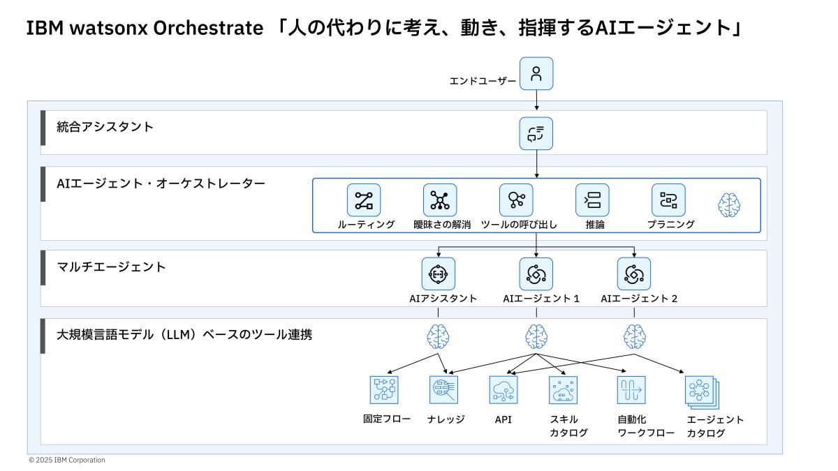 特徴は大きく以下の3点だ。1つ目は「AIエージェント・オーケストレーター」だ。関連部門のエージェントを統合し、業務全体の状況を把握。推論やコード・仕様書などの生成タスクを統合的に管理できる。これにより、AIエージェントが業務を自律的に実行し、ユーザとの対話を促進する「エージェント型AI」として機能する。