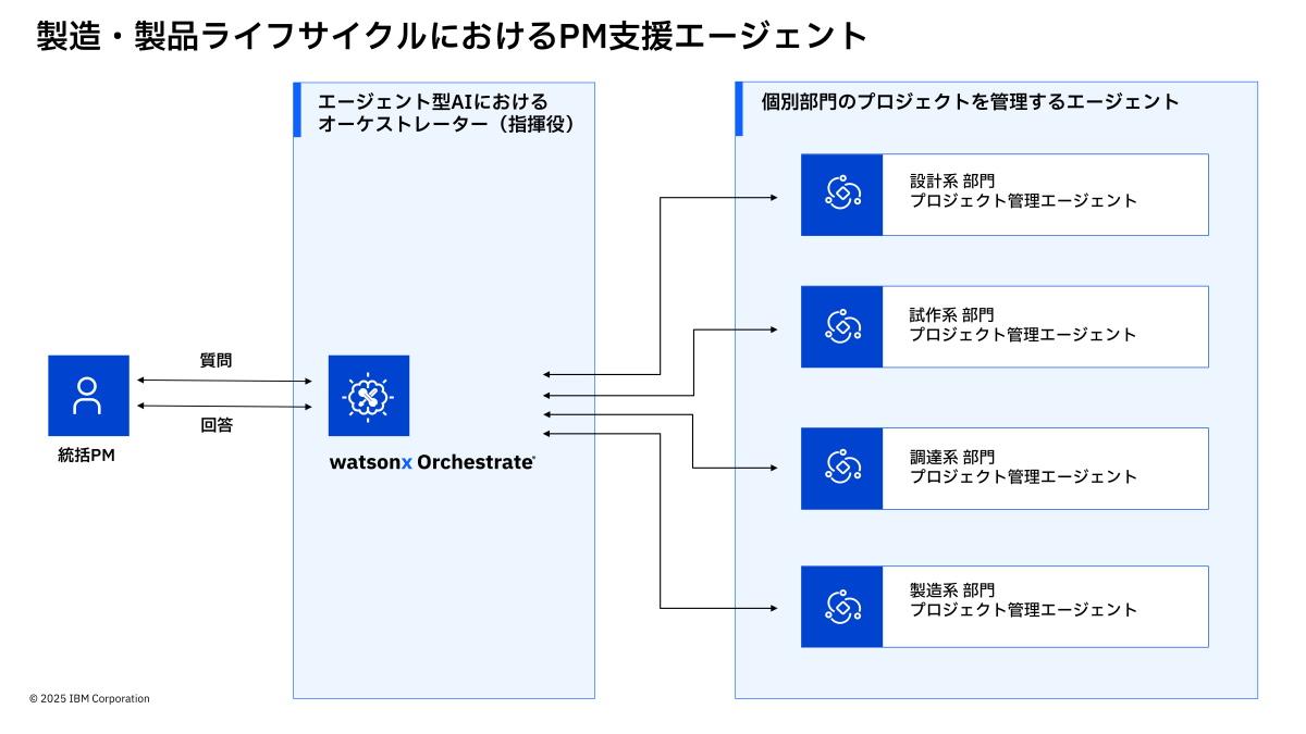 この課題に対し、IBMの支援により、各プロジェクトに専用AIエージェントを配置し、個別のプロジェクト管理をAIが担うとともに、それらを統括する“指揮者役”としての上位エージェントを設置することを提案した。