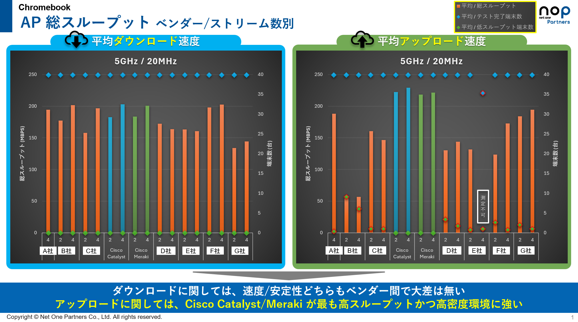 実際の検証結果を、まず総スループット測定から紹介したい。ダウンロード速度では各ベンダーで大きな差は見られず、0.7Mbpsを下回る低スループット端末も発生しなかった。しかし、アップロード速度では明確な差が現れ、多くのメーカーで低スループット端末が発生。中には正常にテストが完了しない製品も見られた。一方、Cisco CatalystおよびMerakiはスループットが他ベンダーより高速で、低スループット端末がなかった。