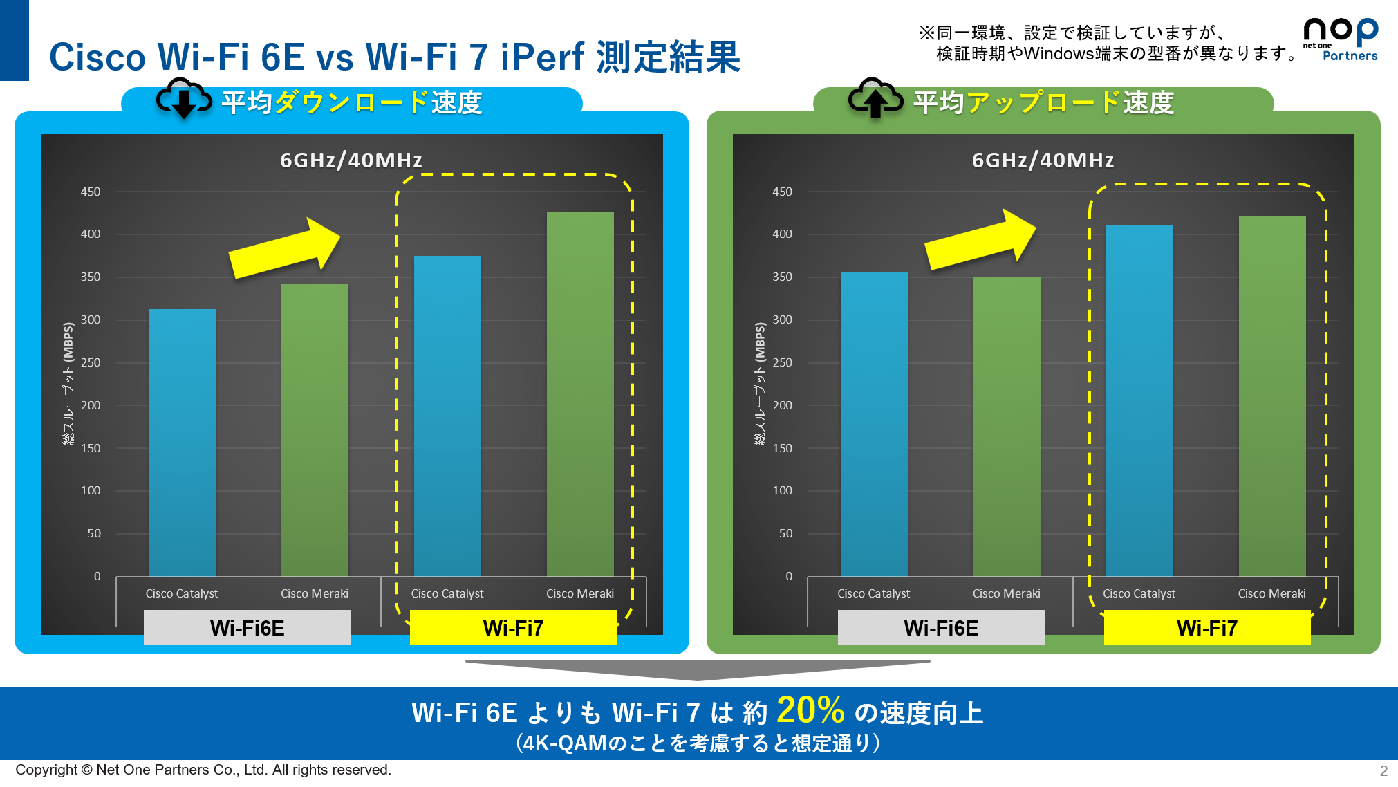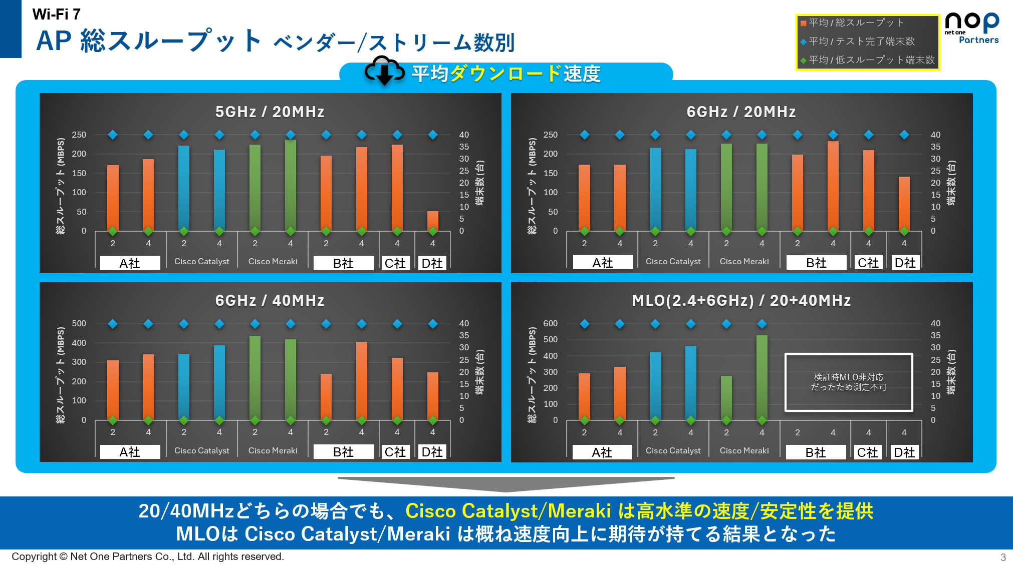 チャネルボンディングとは、複数のチャネル(通信路)を束ねて太い道路のように使う技術と例えると分かりやすいだろう。6GHz/40MHz幅での検証結果では、Cisco CatalystとMerakiが他ベンダーより高いスループットを記録した(図左下)。