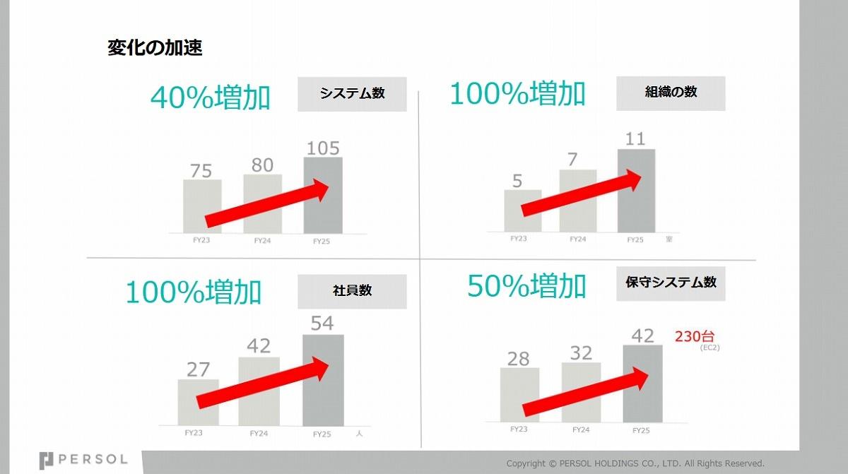 「私が所属するビジネスITアーキテクト部は、主にグループ共通の基幹システムに向けてDXやAI活用の推進を行っており、企画・開発・運用を担っています。グループの成長に合わせてスタッフも増え、運用・保守が必要なシステムも増えています。具体的には、2023年から2025年にかけてスタッフは約2倍、サーバ保守が必要なシステムは約1.5倍に増えました」(菅井氏)