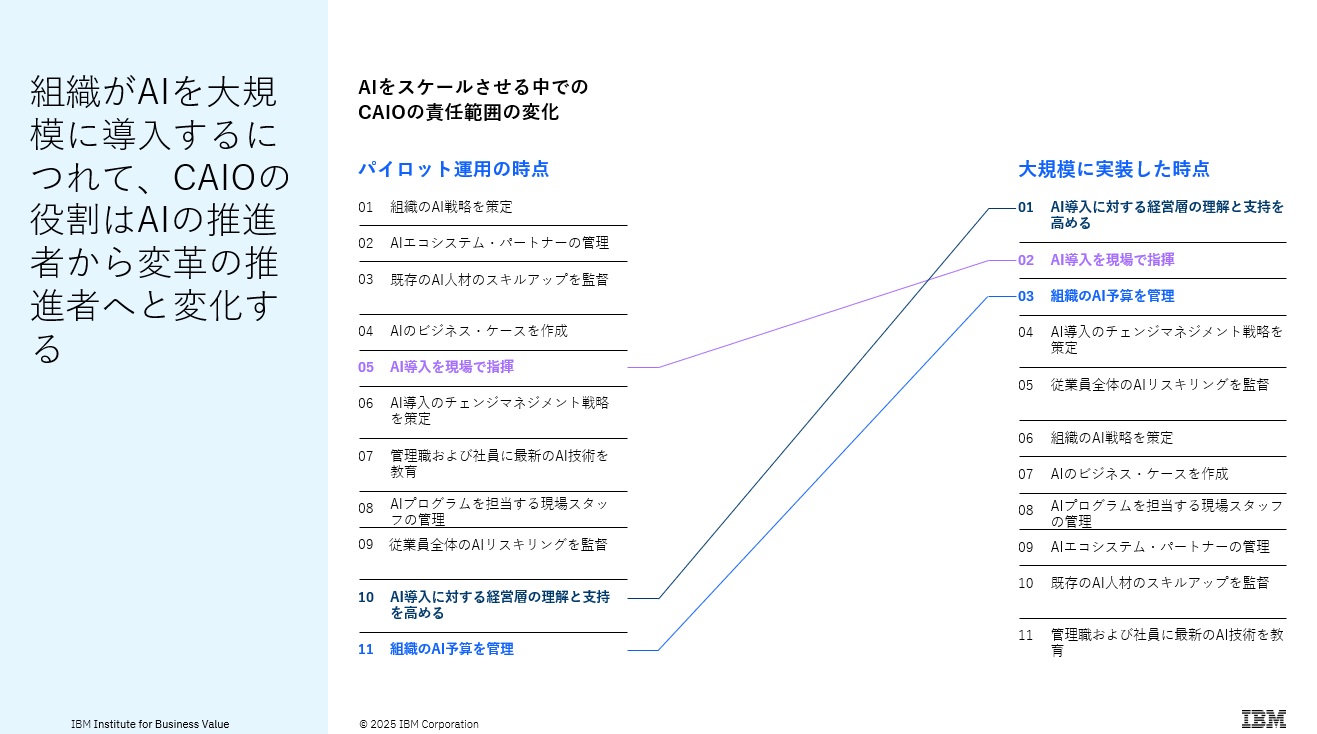 「AIをPoCから全社展開していく上で、企業のAI活用を推進するリーダー(例えばCAIO)の役割も大きく変化します。AIの推進者ではなく『変革の推進者』として、実際の経営戦略、業務課題に結び付けながら全体を見渡して導入を指揮し、予算を握って経営層に投資対効果を示す必要があります」(松瀬氏)