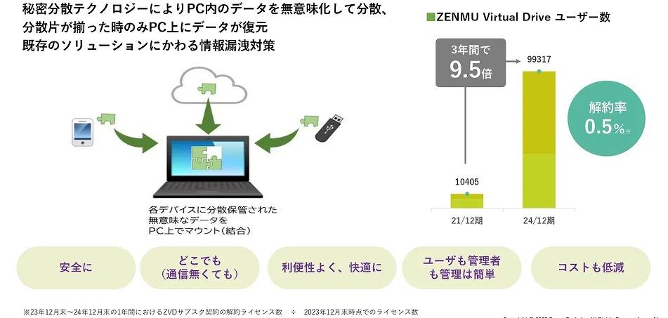 「PCにZVDをインストールすると仮想ドライブが作成されます。そこにデータを保存すると、ドライブ全体を秘密分散によってわずか1KB程度の小さいデータと残りのデータの2つに分割され、小さいデータがクラウド上に保存されます。仮にこのPCが紛失してディスク内を見られたとしても、PC内には1KBの小さいデータが欠けた、残りの分割された無意味なデータがあるだけなので安全です」(佐々木氏)