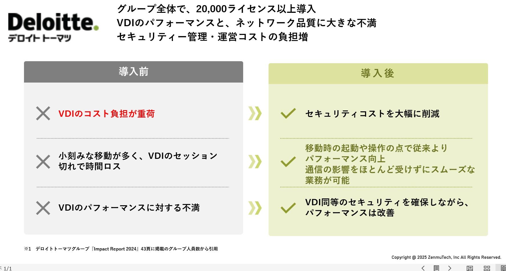 すでに実績も豊富だ。たとえばデロイトトーマツグループは、数万ID規模のVDI環境をZVDに移行し、VDIと同等のセキュリティレベルを維持しながらコストを下げ、レスポンスや操作性を大幅に改善することにも成功したという。