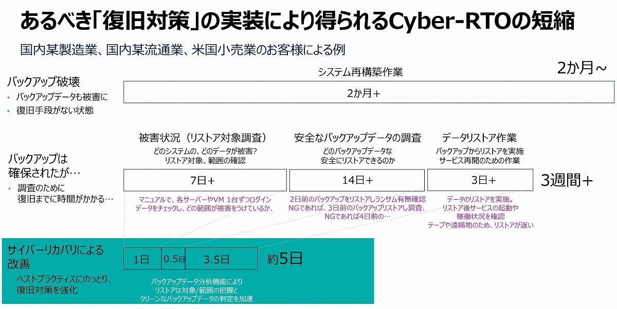 つまり企業は、復旧の際にバックアップの中身が侵害されていないという確証を得るため、1つひとつフォレンジック調査を実施する必要がある。この工程がRTO(Recovery Time Objective:目標復旧時間)を大幅に延ばす原因となり、ビジネスが復旧できずに工場の生産停止などの悪影響につながっていく。