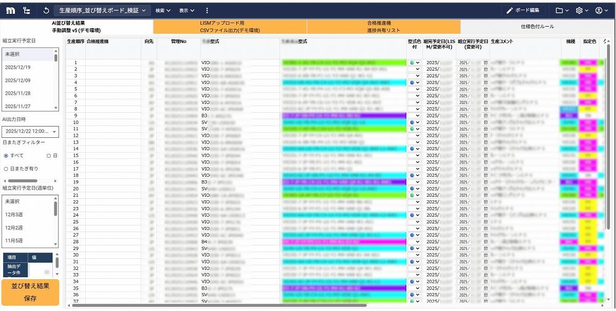 具体的には、Excelシートを用いて機体ごとの仕様に色を付して色彩で判別し、その都度手作業でコピー&ペーストを繰り返して、順序を入れ替えるなどの作業を行っていた。この作業には、熟練者である古賀氏をもってしても毎日5~6時間以上の作業時間を要していたという。さらに、今後も製品の多様化、仕様の増加が予測される中では、人手による計画策定は限界に達していた。