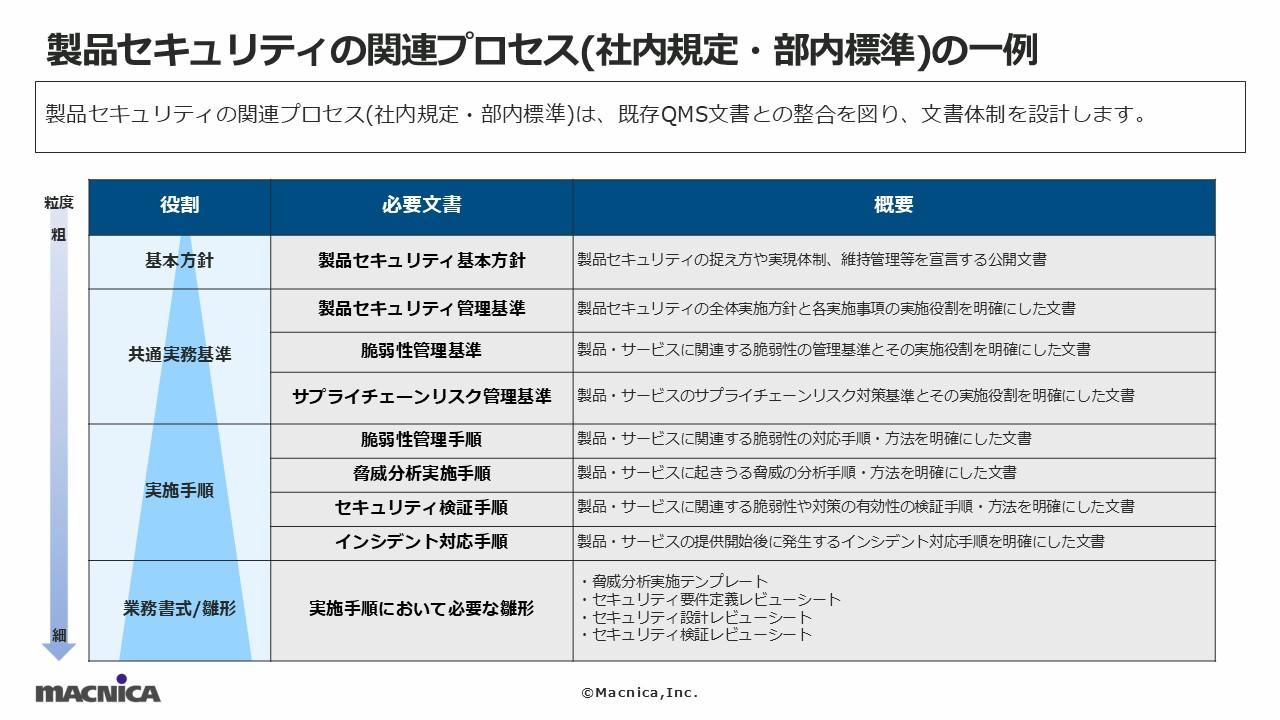 この体系は、全社共通の「基本方針」を頂点に、「管理基準」「手順」「ひな型」といった階層構造で構成される。たとえば、「脆弱性管理基準」では脆弱性への対応方針を定め、「脅威分析手順」では具体的な分析手法を定義する。