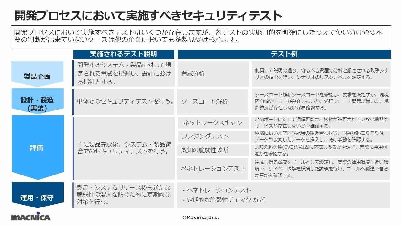 評価フェーズでは、ネットワークスキャンや脆弱性診断、ファジングテストといった動的なテストを実施し、未知の脆弱性も含めて徹底的に洗い出す。飯田氏は、「特にファジングテストやペネトレーションテストは、製品固有の脆弱性を発見する上で有効ですが、コストもかかるため、製品のリスクに応じて実施対象を絞るなど、費用対効果を考慮する必要があります」と語る。