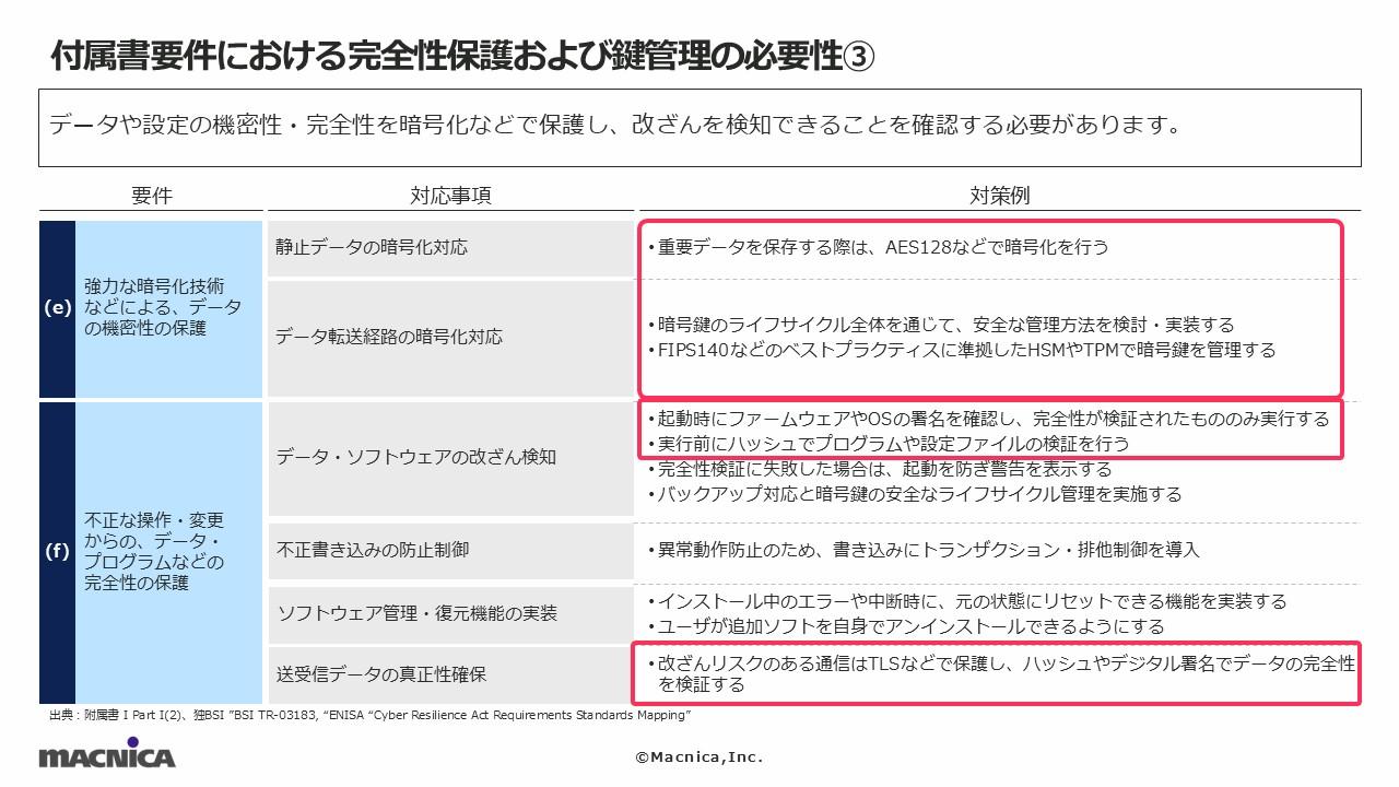 たとえば、「セキュリティアップデートによる脆弱性への対応」では、アップデートファイルが改ざんされていないことを確認するため、デジタル署名による検証が求められる。「不正アクセスからの保護」では、認証情報の通信をTLSなどで暗号化し、盗聴や改ざんを防ぐ必要がある。さらに、「プログラムの完全性の保護」として、ソフトウェア自体が不正に書き換えられていないかを検証する仕組みも要求される。