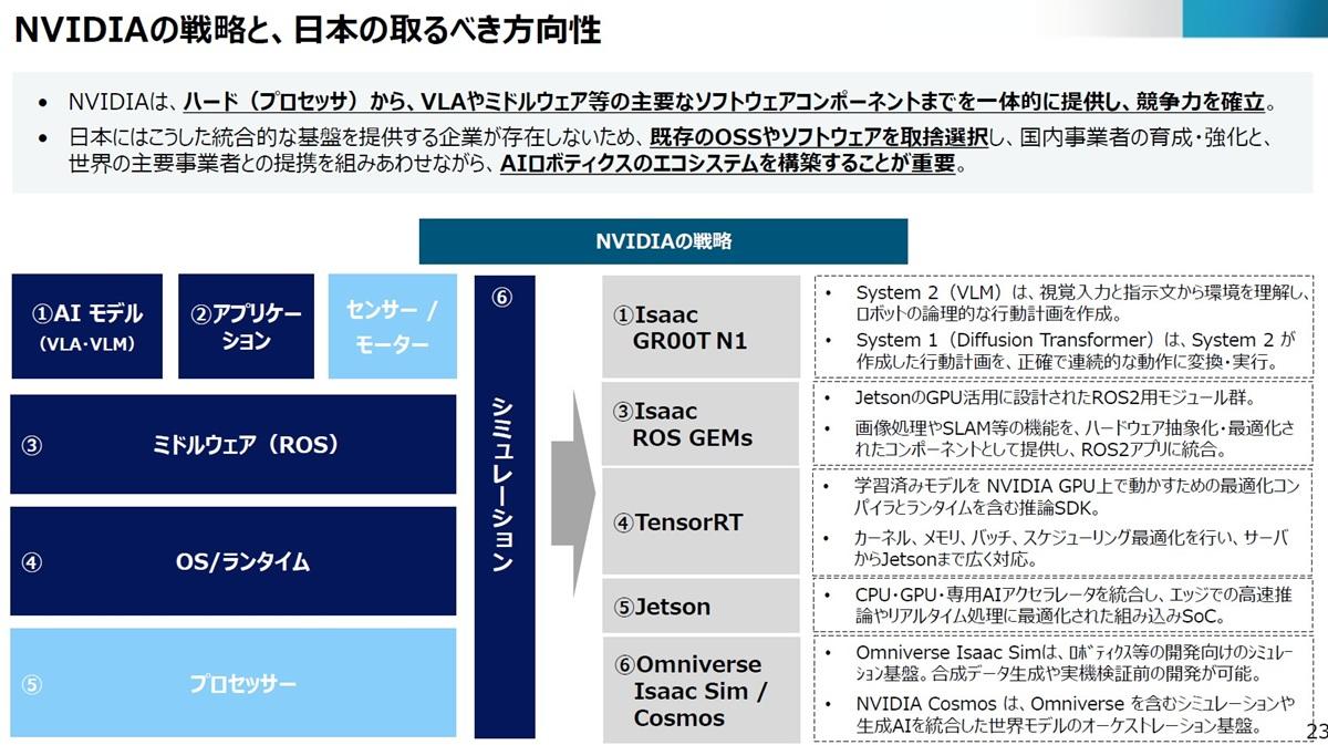 たとえば、エヌビディアはハードからソフトまでを一体的に供給することで競争力を持つが、日本にはこうした統合的基盤を供給できるエコシステムが存在しないことも大きなマイナス要素になっている。