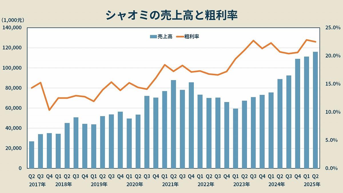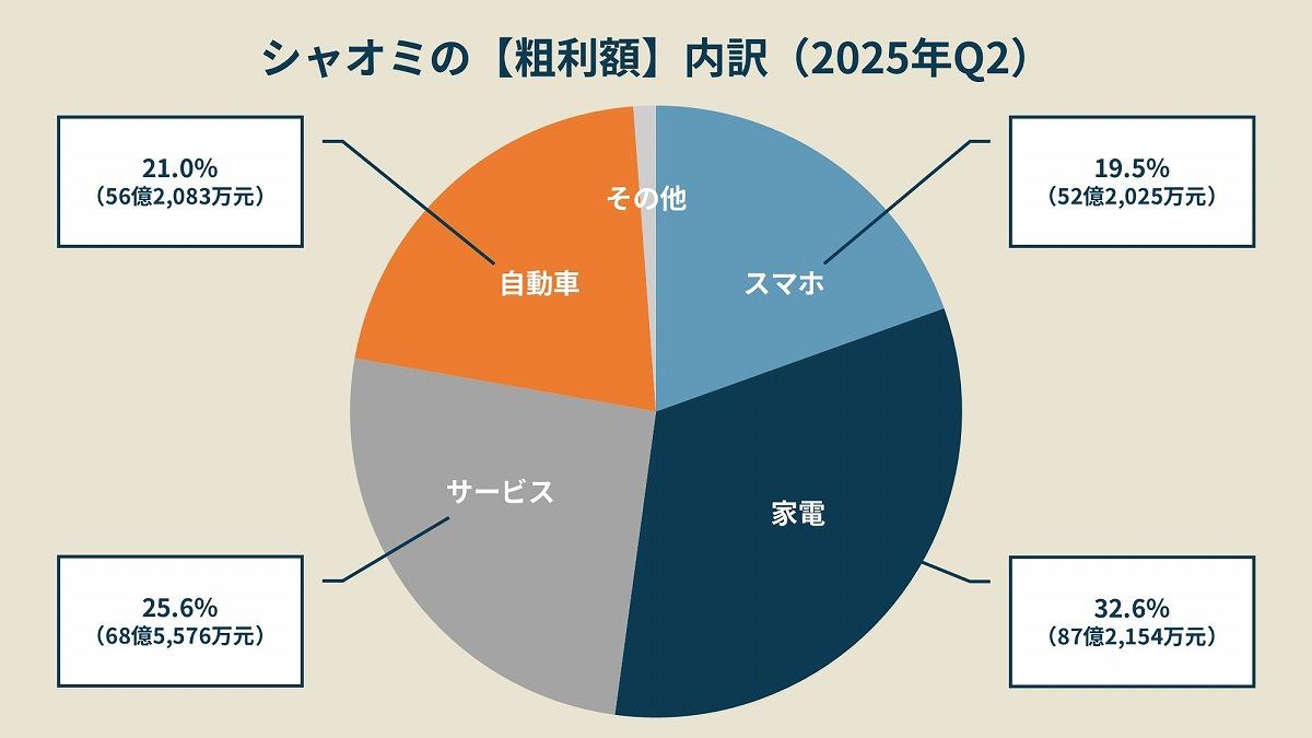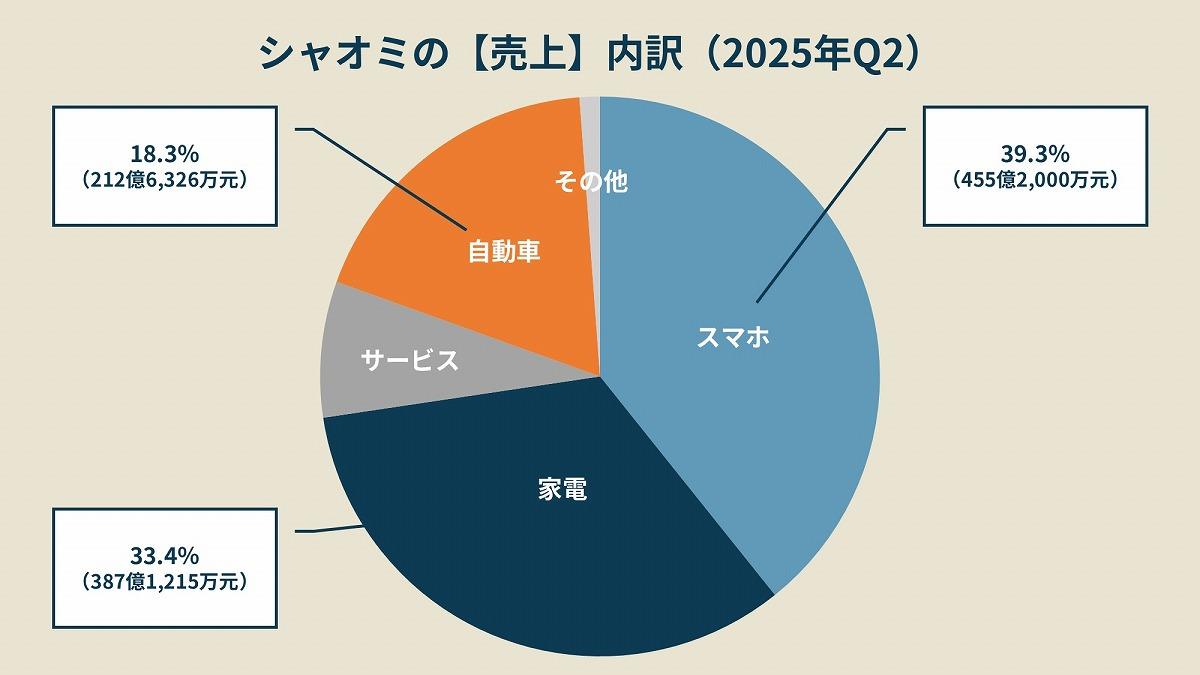 シャオミの祖業は2011年から発売を始めたスマホだ。そのため、国内外問わず「シャオミはスマホの会社」と認識している人は多い。その認識は正しく、2025年Q2のスマホの売上は455.2億元(約9,800億円)で、シャオミ全体の売上の39.3%を占める。次に大きいのが家電で387.1億元(約8,300億円)、そして自動車の91.0億元(約1,950億円)と続く。
