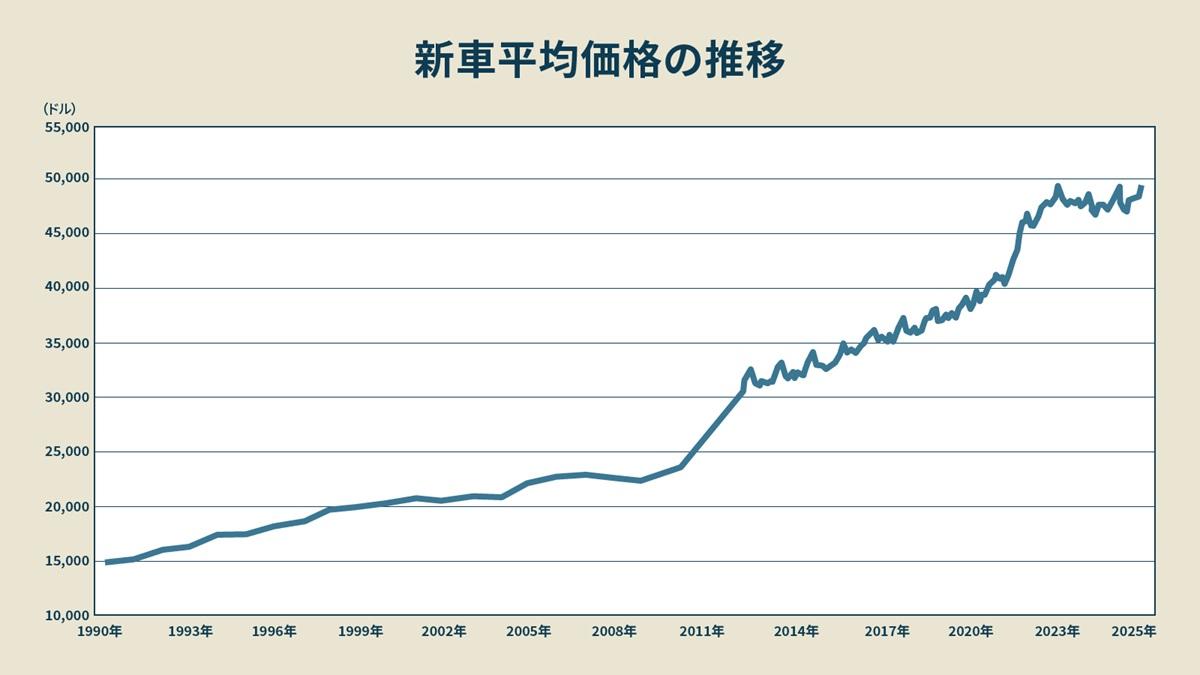 ところが、翌2012年に新車平均価格は3万ドル(約450万円)を突破して急激に上昇し、過去5年間だけでも25%余りも値上がりした。ついに2025年9月には、5万ドル(約760万円)を超えてしまったのである。