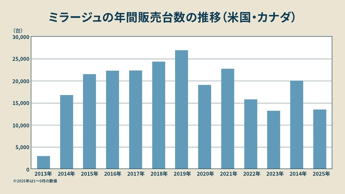 ところがミラージュは、新車価格の高騰により価格面での競争力が相対的に増す一方で、人気は必ずしも高くなかった。2013年から2025年までの北米市場における年間販売台数を見ても、2019年に2万7000台でピークを記録して以来、低迷を続けていた(図2)。
