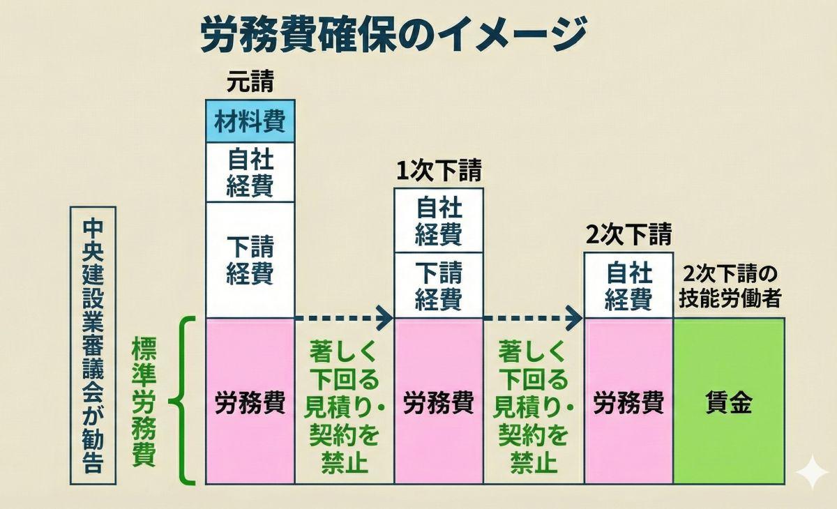 上記の改正と並行して注目されているのが、「労務費の基準」制度の創設です。これは、建設工事における労務費の適正水準を明らかにし、技能者に正当な対価が確実に支払われる仕組みの整備を目的としています。“現場に必要な人件費が残るかどうか”を左右する、今回の改正の中核ともいえる仕組みです。