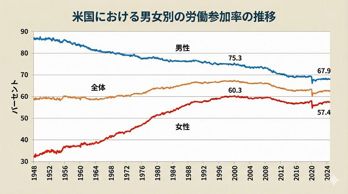 女性は1948年の30%台前半から2024年に57.4%とほぼ倍増しているのに対し、男性は90%近くから67.9%まで低下している。米アトランティック誌が指摘するように、経済力の低い男性の増加は、「結婚に適した男性の減少」をもたらす。