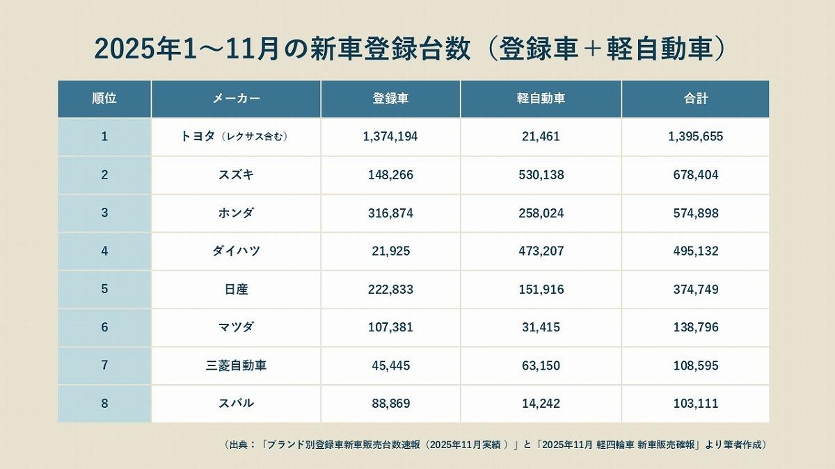 2025年の国内新車販売を振り返ると、メーカーごとの勢力図にははっきりとした特徴が表れているようです。2025年1月~11月の登録車と軽自動車の新車販売の数字を整理してみると、1位は139万5655台を販売したトヨタ(レクサス含む)となりました。そして、それに続いたのがスズキです。登録車14万8266台と、軽自動車53万138台で合計67万8404台。軽自動車の販売では、ライバルであるダイハツを上回る1位になっています。