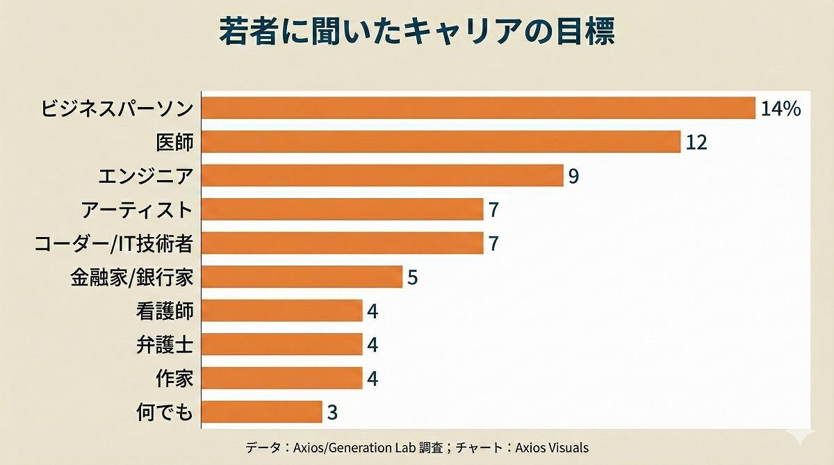 一方、若者たちの「本音」がわかる別の調査もある。2023年に824人の18~29歳の回答者に、「キャリア目標」をたずねたところ、1位のビジネスパーソン(14%)を筆頭に、医師(12%)、エンジニア(9%)と続いたほか、4位に芸術家(7%)、8位には作家(4%)が入った(図4)。