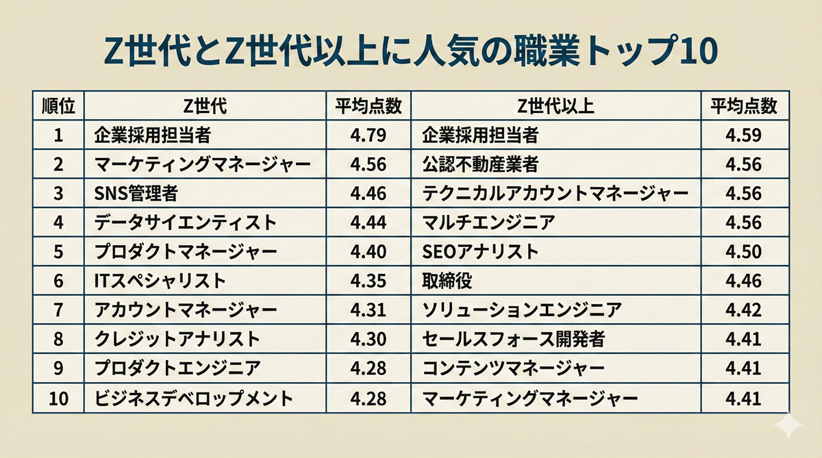 やはり情報・専門サービスなど専門職が人気である。そして、意外なのが、管理者やマネージャーを抑えて1番人気の職業が「企業採用担当者」であることだ。参入のバリアが低い上に、昇進が早く、給与も悪くないからである。現実的に生活面を考えつつ、さらに満足度も高い職業がZ世代に人気であることが垣間見える。