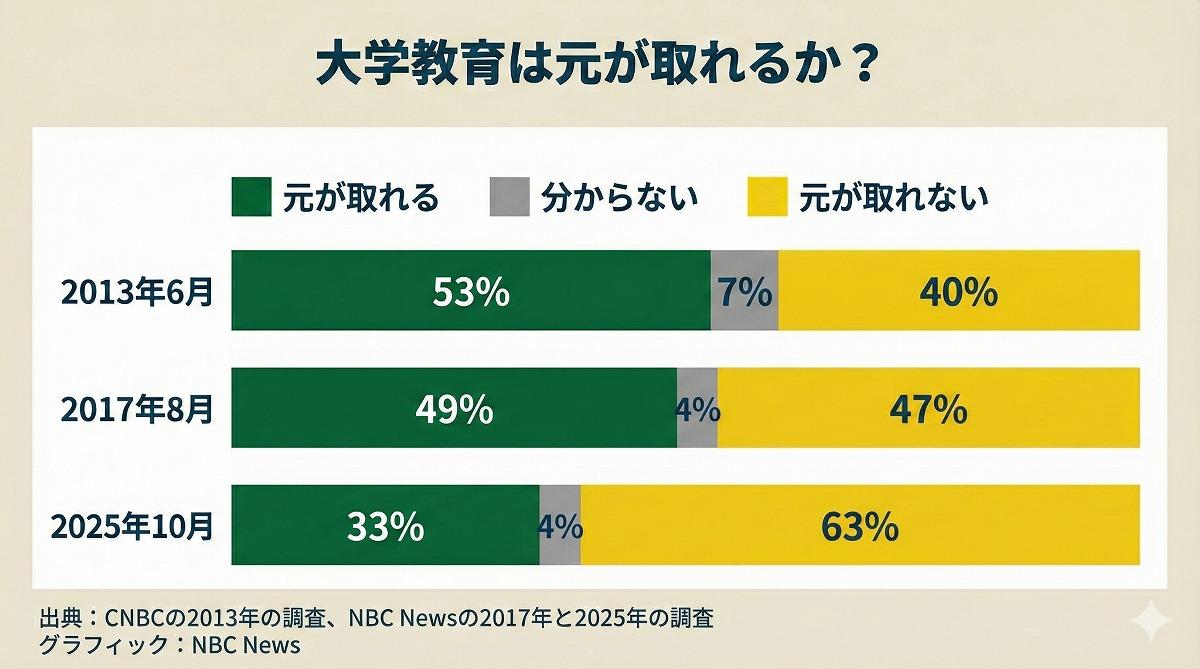 こうした状況もあり、米NBCニュースは1000人の米国人成人を対象にした10月の世論調査で、半数以上の63%の回答者が「大学教育は元が取れない」と回答したことを明らかにした(図6)。