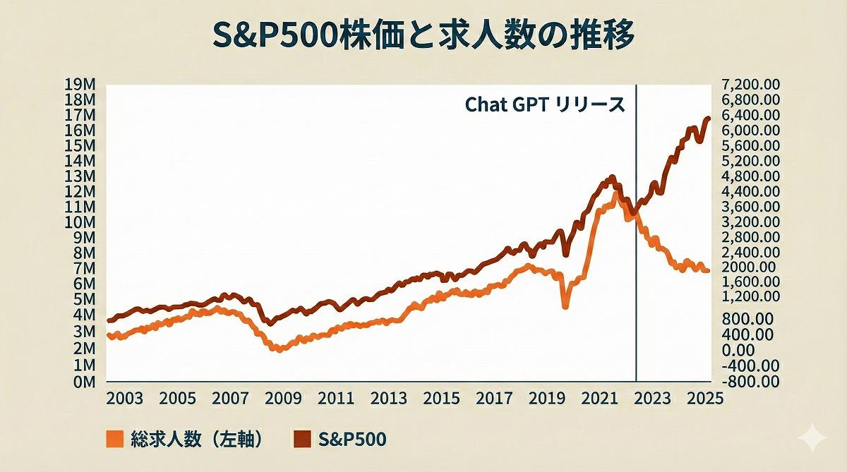 Z世代の「受難」はさらに続く。ChatGPTなどLLMが日進月歩の進化を遂げる中、雇用主がエントリーレベルの仕事をAIに任せ、新卒者の採用を控え始めたことを示唆するスタンフォード大学の研究が注目を集めている。さらに興味深いことに、OpenAIがChatGPTをリリースした2022年を境に、S&P500株価が右肩上がりで上昇する一方、求人数は急落する「K字型」を形成している(図7)。