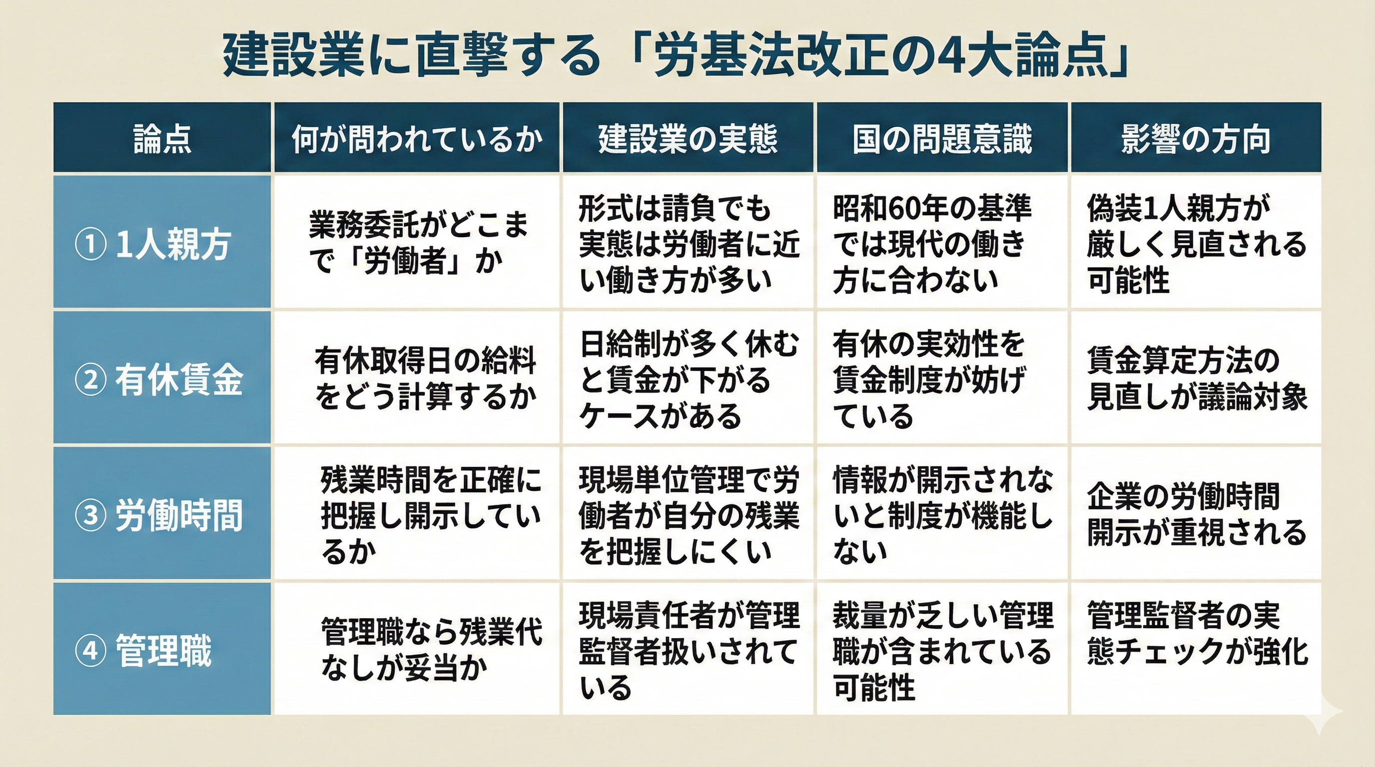 今回の労働基準関係法制を巡る議論は、単なる規制強化や緩和を目的とするものではなく、現代の働き方に即した制度の再整理を目指すものです。特に建設業においては、偽装1人親方問題、年次有給休暇取得時の賃金算定、労働時間の情報開示や管理監督者の位置づけなど、実務に直結する論点が多く含まれています。