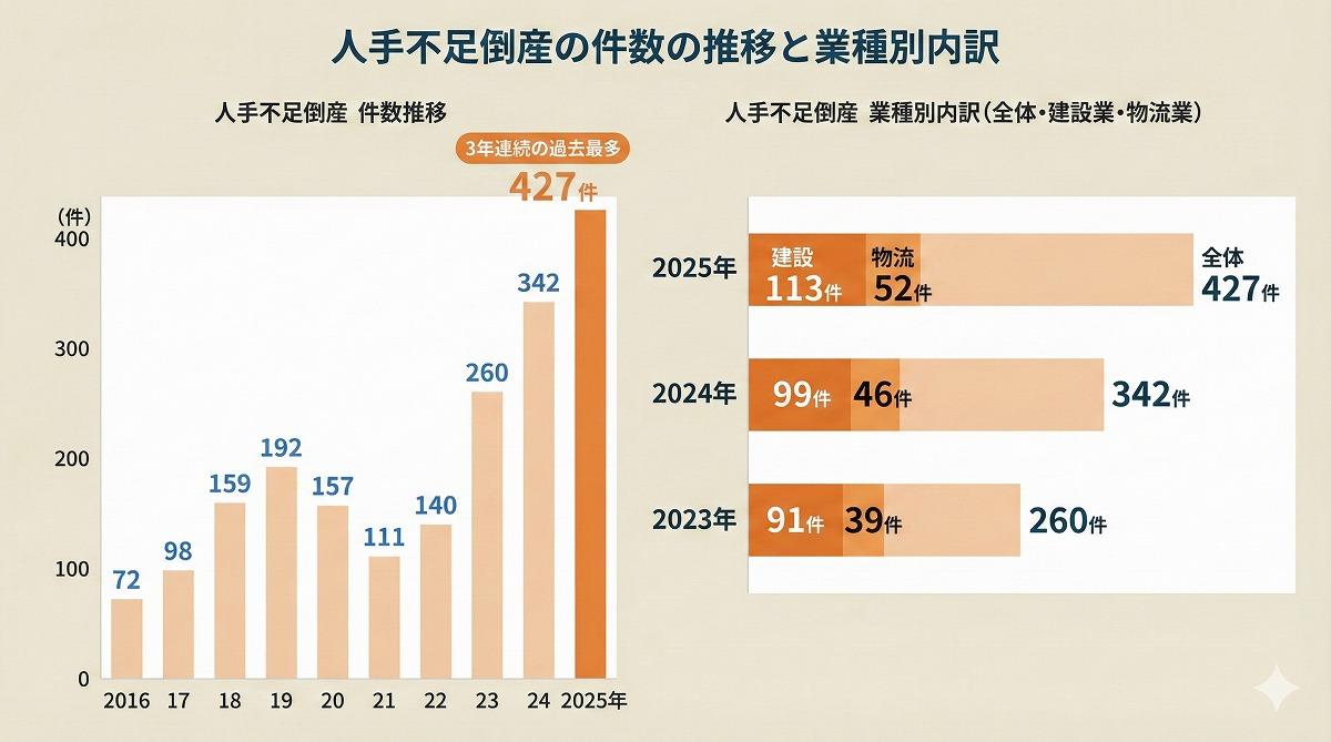 「人が足りない」だけで企業が倒れるのか。そうした疑問が広がるのは、建設・物流の倒産が“需要の減少”とは別の理由で増えているためだ。帝国データバンク(TDB)は、従業員の退職や採用難、人件費高騰などを要因とする「人手不足倒産」(法的整理、負債1,000万円以上)を集計し、2025年は427件と公表した。前年の342件から24.9%増え、初めて年間で400件を超えた。業種別では建設業が113件、物流業が52件で、いずれも過去最多だった。