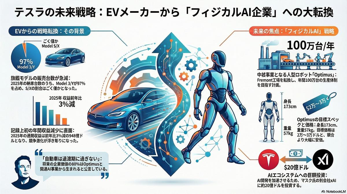 また、テスラはAI関連の取り組みを強化するため、マスクCEOが関与するAI企業xAIへの出資拡大も明らかにしており、自社製ロボットや自律走行車両の技術統合を進めるとしている。これらの動きにより、同社の経営資源は従来のクルマ開発から次世代テクノロジーへの移行が明確になった。