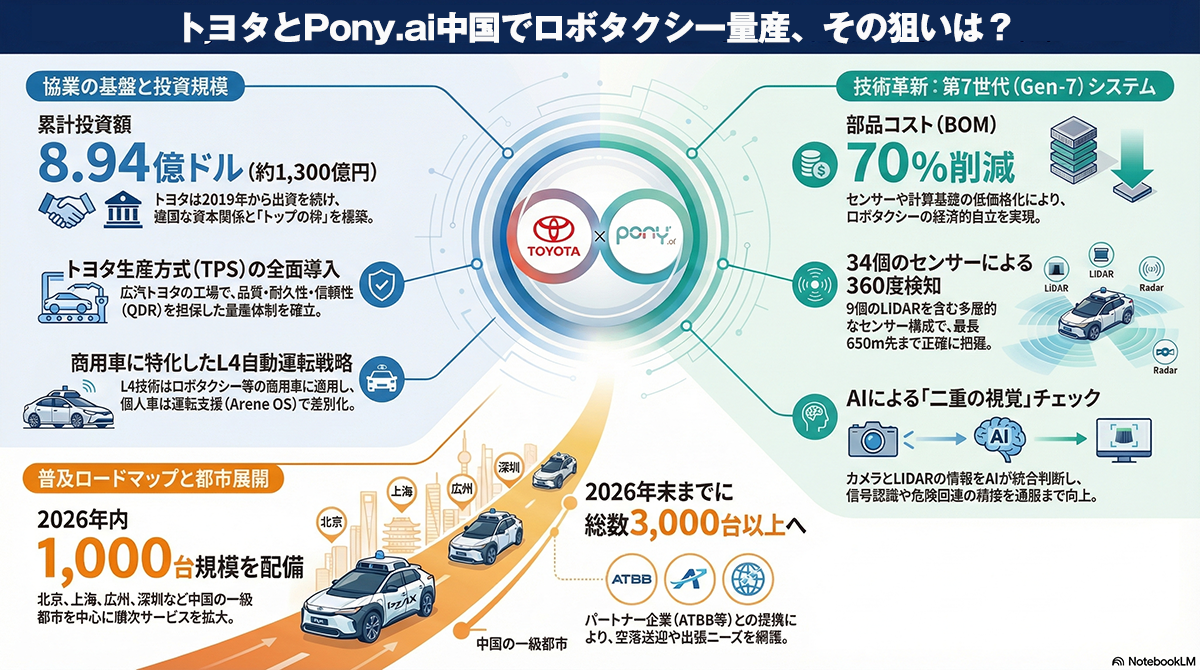 今回の量産開始は、2019年から続く両社の戦略的提携の結実である。トヨタは2020年にPony.aiへ4億ドルを出資しており、これまでは既存のトヨタ車にPony.aiのシステムを後付けで搭載して運行していたが、今後は共同開発された専用車両への切り替えを進めることになる。これにより、トヨタはPony.aiとの合弁会社を通じて、巨大な中国市場におけるロボタクシー事業へ本格的に参入する足場を固めた。事業化の最大の鍵は、コスト削減と信頼性の向上にある。今回投入される車両には、Pony.aiの最新技術である「第7世代(Gen-7)自動運転システム」が搭載されている。このシステムは大規模な商用展開を前提に設計されており、前世代と比較して部品表(BOM)コストを約70%削減することに成功した。具体的には、自動運転用コンピューターで80%、LiDAR(ライダー)で68%のコストダウンを実現しており、ロボタクシー事業の経済的な採算性を大きく高める要因となっている。